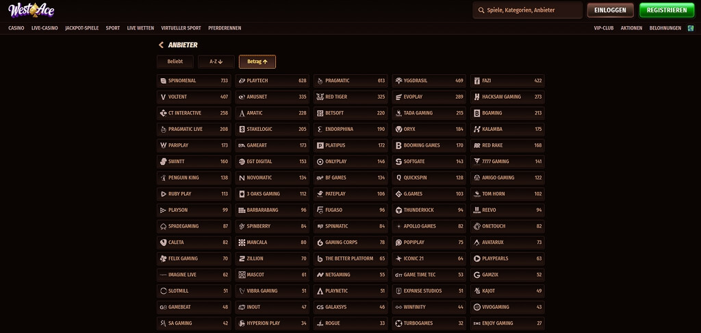 Das Spielangebot von WestAce Casino umfasst eine breite Auswahl klassischer und moderner Casinospiele. Dazu gehören virtuelle Automatenspiele, Tischspiele wie Roulette oder Blackjack sowie Live Casino Formate mit echten Dealern. Alle Spiele sind auf Echtgeldbasis ausgelegt und richten sich an Spieler, die echtes Risiko und reale Gewinnchancen suchen.